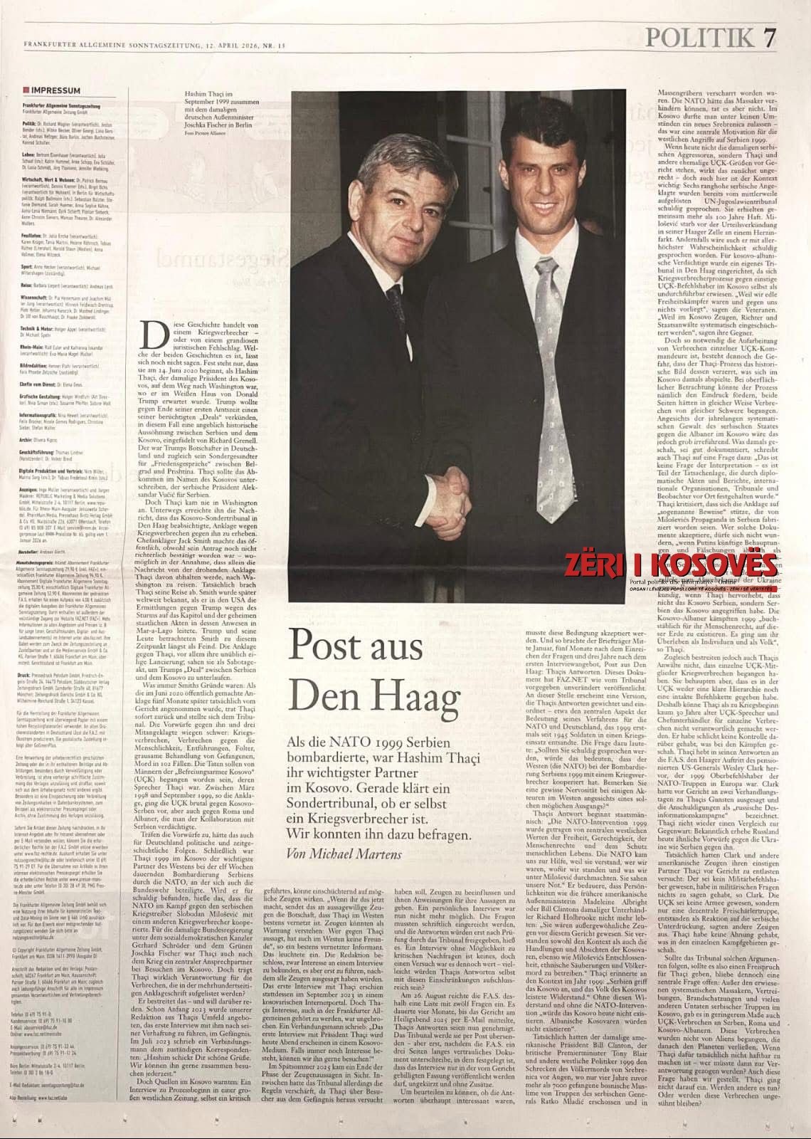Me këtë titull, në numrin e fundit të gazetës „Frankfurter Allgemeine Sonntagszeitung“ (FAS), një faqe e plotë i kushtohet artikullit të gazetarit Michael Martens, që trajton ish-presidentin e Kosovës në burgun e Hagës, zotin Hashim Thaçi. Në faqe është vendosur edhe një fotografi e madhe e Hashim Thaçit dhe Joschka Fischer-it nga një takim i tyre zyrtar në Bonn, në vitin 1999, pas Konferencës së Rambujesë (Rambouillet).